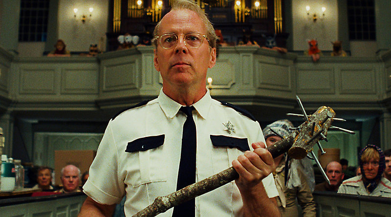 Роль капитана Шарпа сыграна Брюсом Уиллисом очень серьезно: пока вокруг творится комедия, мистер Шарп сосредоточен, суров и непроницаем. Впрочем, такой контраст только добавляет комедии красок, и потому «Королевство Полной луны» выглядит идеально не только в визуальном плане (киноязык Уэса Андерсона вообще отдельная тема), но и в сюжетном.