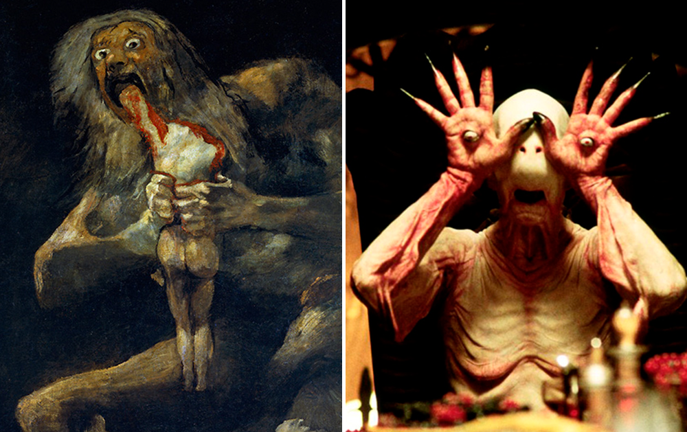 Какой оригинал – такая и адаптация. Бледный человек из «Лабиринта Фавна» Гильермо дель Торо стал не просто частью сцены, до боли (и ужаса) похожей на картину «Сатурн, пожирающий своего сына» Франциско Гойи. Этот жуткий персонаж появился исключительно благодаря картине испанского художника - и от своего «предка» он унаследовал, отчасти, и аппетит.