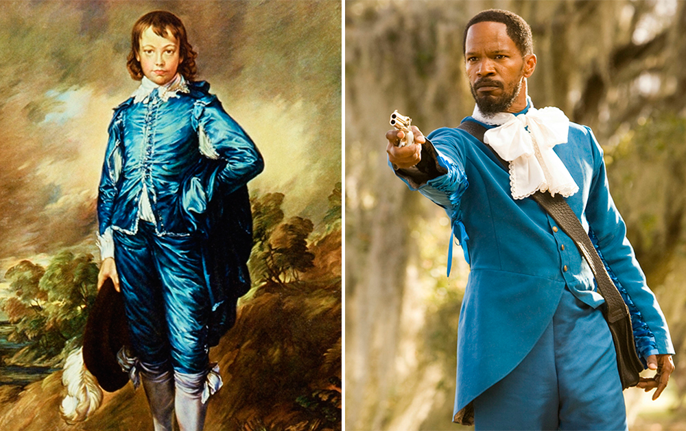 Один из самых ярких и даже сильных эпизодов фильма «Джанго освобожденный» Квентина Тарантино (на пару с разбитым бокалом Ди Каприо). Не обошлось и без фирменного юмора режиссера, конечно. Этот выход Джанго в голубом костюме стал целым символом эпохи, социальной мысли времен освобождения от рабства, свободы и гордости. Можно подумать, Тарантино специально сопоставил именно с этой картиной своего героя, ведь «Мальчик в голубом» британца Томаса Гейнсборо – чистое олицетворение классического аристократа, «голубая кровь», если хотите. Таким образом Тарантино смог подчеркнуть внушительный социальный контраст со всеми вытекающими отсюда проблемами.