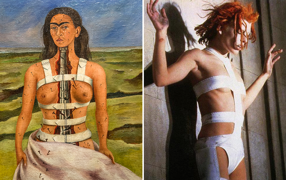 Мистическая, странная, неземная Фрида Кало со своим видением социума, искусства и жизни. Мистическая, странная и буквально неземная Лилу из «Пятого элемента», которая являет собой что-то радикально новое для человечества. Эти две необычные фигуры модельер Жан-Поль Готье, создававший костюмы для фильма Люка Бессона, соединил, создав образ Лилу в этих уже культовых белых одеяниях.