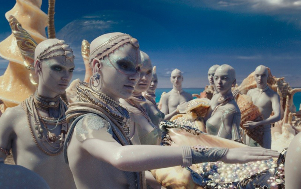 Выше рассказан «костяк» сюжета, однако на деле то, что показывает нам «Валериан», гораздо, гораздо масштабнее и сумбурнее – отчасти поэтому почти все описания сюжета фильма, которые можно найти в сети, создают совершенно неверное представление о действе, которое нас ждет. Однако если сюжет еще можно обрисовать в общих чертах, то рассказать о том, что развернется перед вашими глазами, решительно невозможно. Когда Валериан и Лорелин будут выполнять свое первое задание на черном рынке, существующем одновременно в нескольких измерениях/ реальностях, у вас захватит дух от того, как это «построено» и снято – многоуровневый, пестрый, колоритный мир, где можно встретить инопланетян всех мастей и размеров, продуман до мельчайших деталей, он живой, он настоящий. Прибытие в Альфу, город тысячи планет, тоже начнется с мини-экскурсии по этому научно-фантастическому «многополярному» местечку, и вы лишний раз поймаете себя на мысли, что фантазия Люка Бессона, кажется, безгранична, и надо во время повторного просмотра поближе разглядеть тот или иной момент. По ходу продвижения героев к центру Альфы зрителям будут показывать то один, то другой уголок этой станции, и ни в одном случае не будет возникать ощущения «искусственности», неестественности, нереалистичности этого мира. Графика хороша, это понятно – привлекший лучших специалистов со всего мира Бессон, будучи одним из самых стильных режиссеров современности, смакует каждый нюанс, будь то внешность какого-нибудь грымзы-инопланетянина, бабочка-приманка, жемчужины перлов или даже какая-нибудь выскакивающая из-за угла непонятная штуковина. Вместе с тем режиссер не просто вываливает перед зрителем гору спецэффектов и необычностей, а рассказывает историю с помощью такой яркой, пестрой и многозначной визуальной составляющей ленты. Именно «глазами», например, мы знакомимся с теми же перлами – здесь нет диалогов, но исходя из того, что мы видим, у нас в голове формируется представление об их образе жизни, отношениях внутри общины и переживаниях.