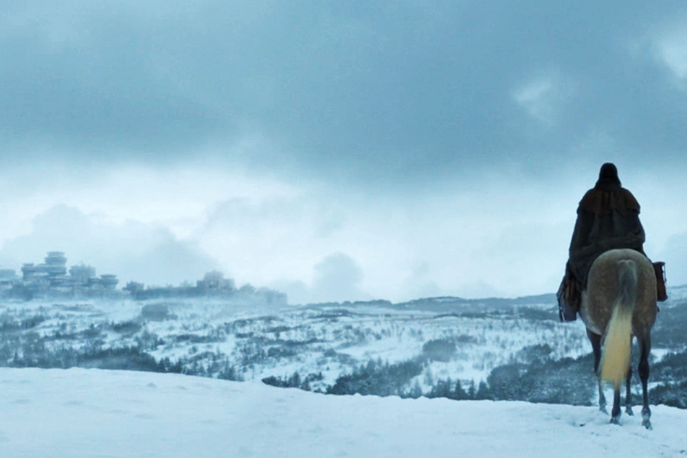 Съемочный процесс сейчас проходит в Северной Ирландии, заснеженные виды которой мы наблюдаем на снимке. Как видим, в кадр попала загадочная фигура на коне: