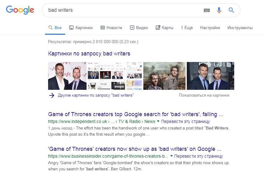 Шалость удалась! Теперь если ввести в поисковике запрос «плохие сценаристы», первыми появятся имена авторов сценария 8 сезона «Игры престолов».