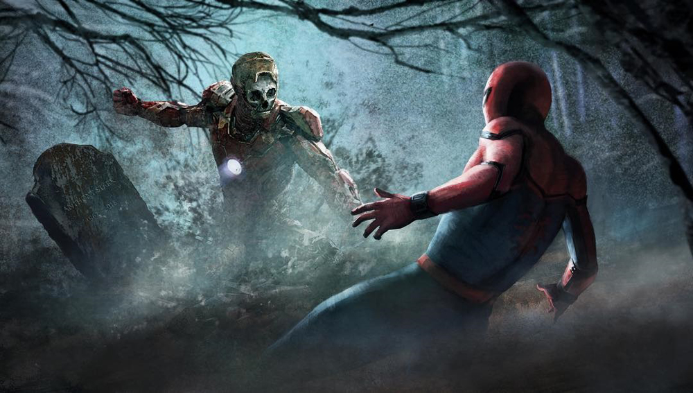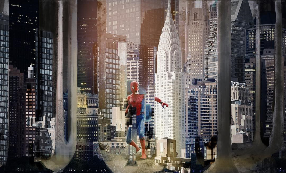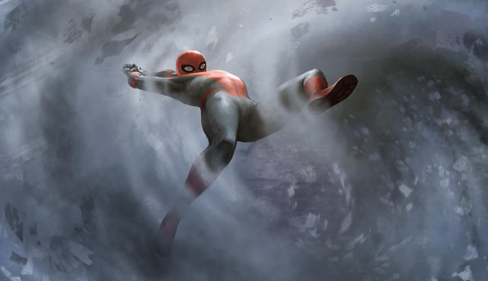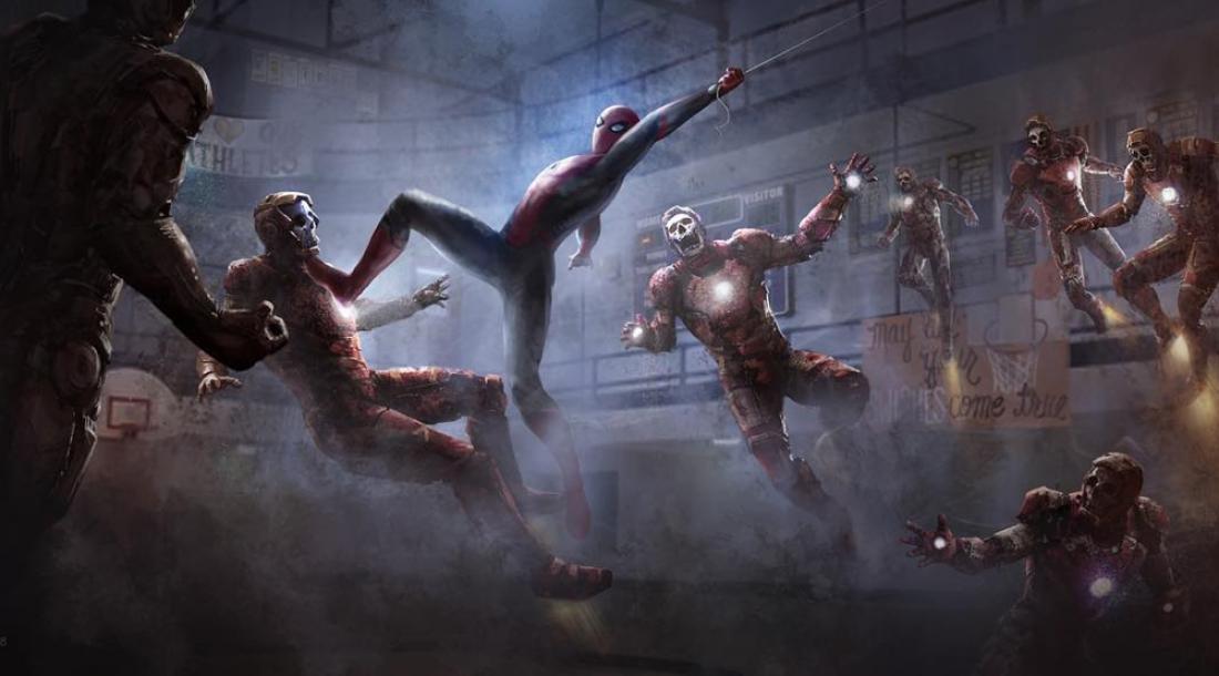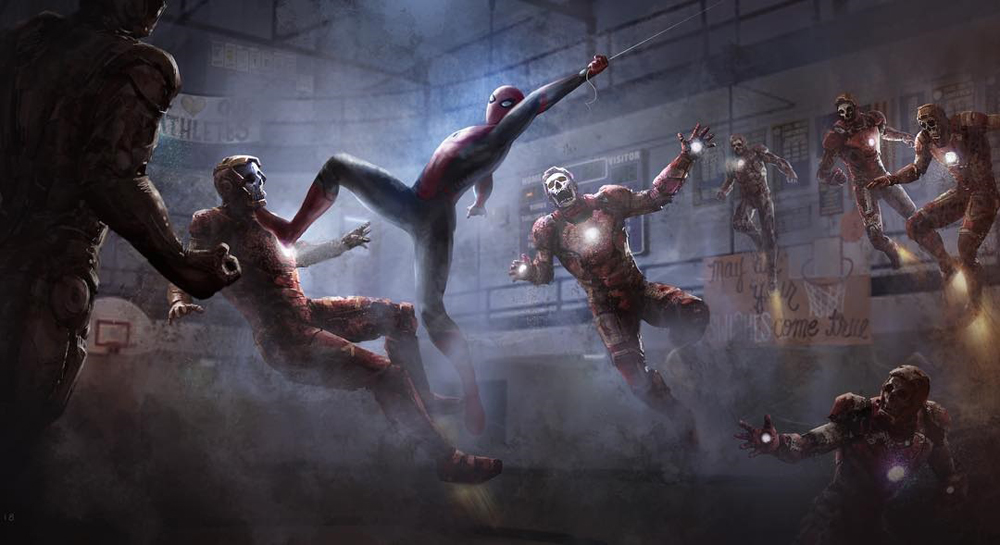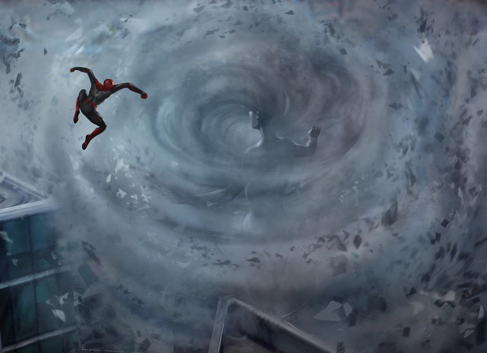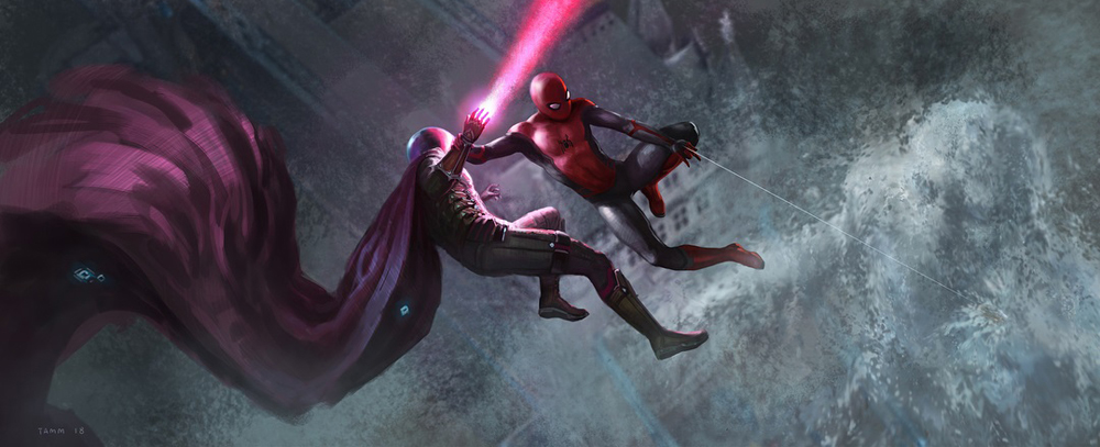 Большинство этих работ посвящено иллюзиям Квентина Бека/ Мистерио (Джейк Джилленхол). Так, на артах Питер Паркер (Том Холланд) сражается с целой армией зомби Железных людей, гигантским комаром и самим Квентином. Еще есть сцены с элементалями, Ником Фьюри (Сэмюэл Л. Джексон) и Эм-Джей (Зендая).