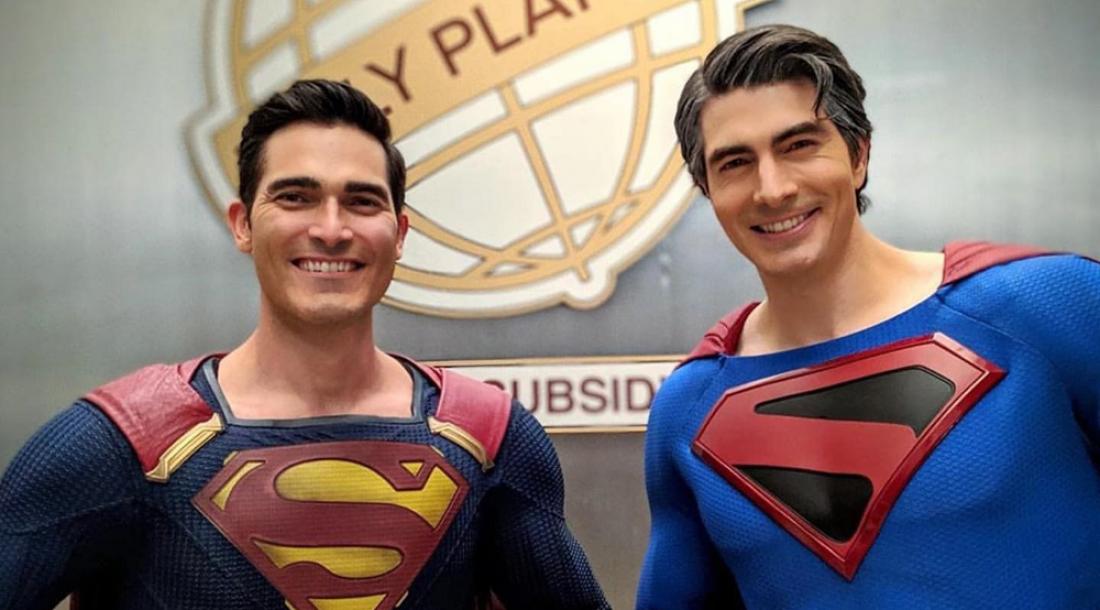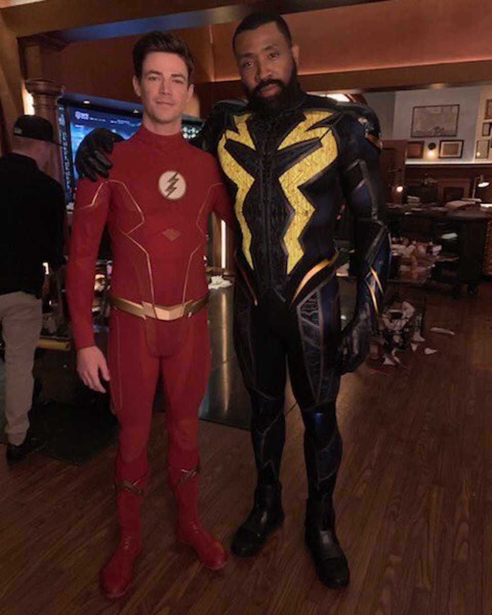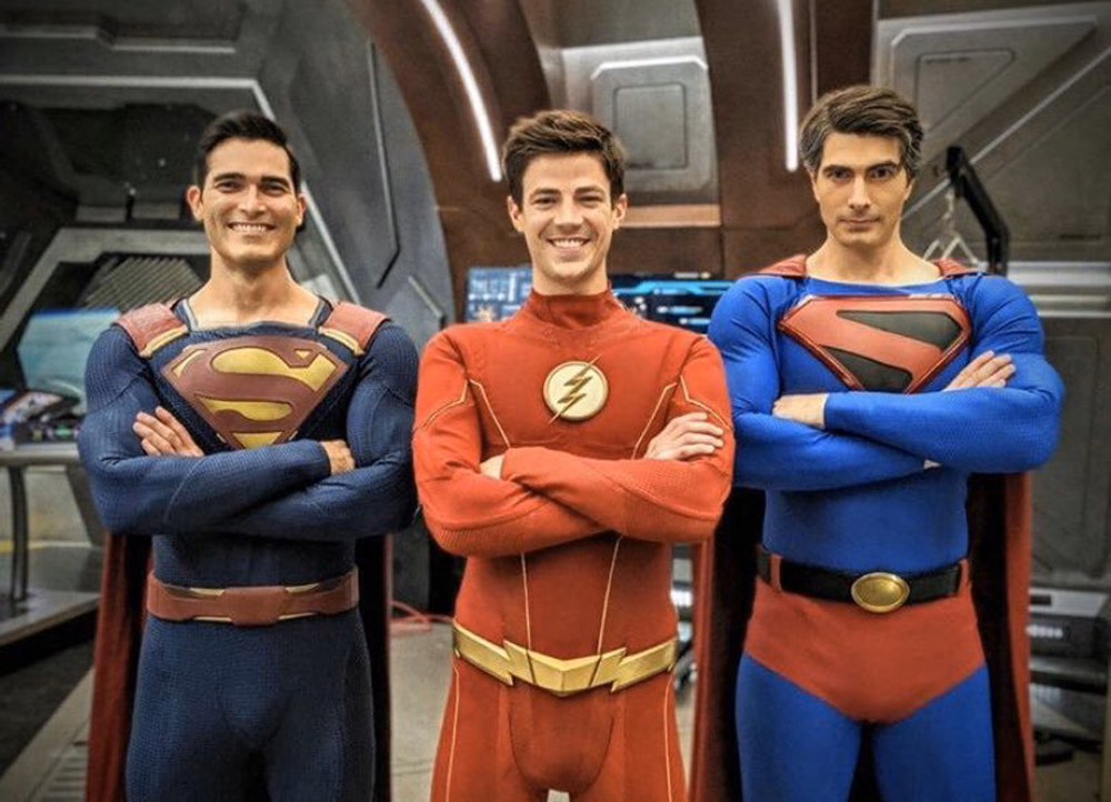 На двух снимках Барри Аллен/ Флэш (Грант Гастин) засветился в компании Супермена (Тайлер Хэклин) и Джефферсона Пирса/ Черной Молнии (Кресс Уильямс) из его же телевселенной, а также Кларка Кента (Брэндон Рут) из фильма «Возвращение Супермена» 2006 года: