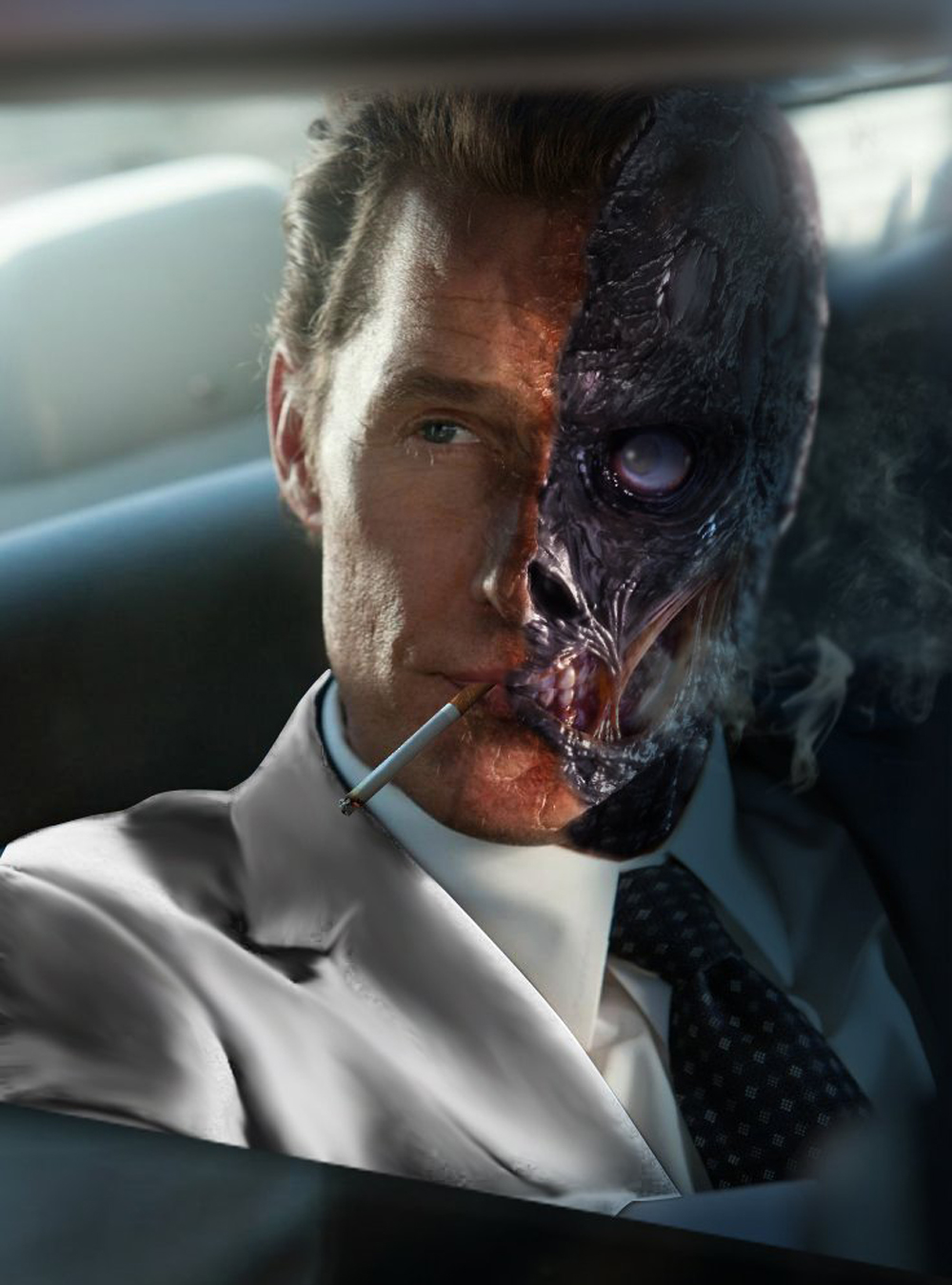 А еще на этой неделе в Сети появился слух, что в фильме снимется Мэттью МакКонахи, ему пророчат роль Харви Дента/ Двуликого. Художник в честь этого выложил такой арт: