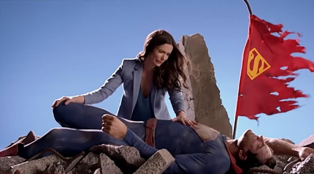 В ролике показали трагическую сцену с Лоис Лейн, оплакивающей смерть возлюбленного Супермена из одной из версий Земли. Мы видим репортаж, в котором передают, что Человека из стали убил его заклятый враг Лекс Лютор: