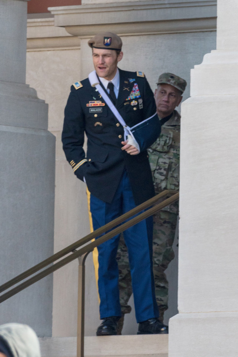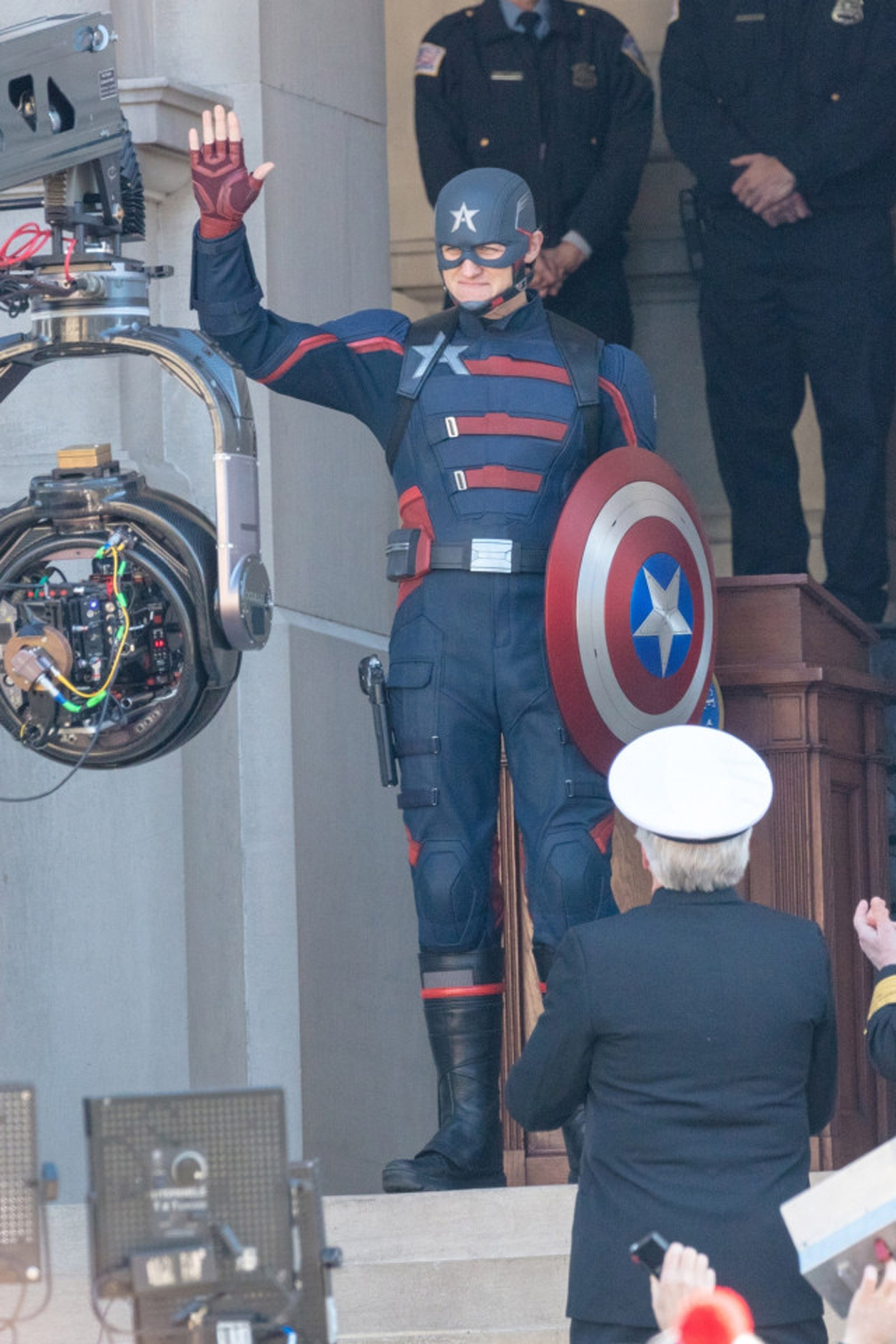 На снимках запечатлен Джон Уокер в исполнении Уайатта Рассела. Герой предстал в военной форме и в обновленном костюме Кэпа с щитом Стива Роджерса (Крис Эванс):