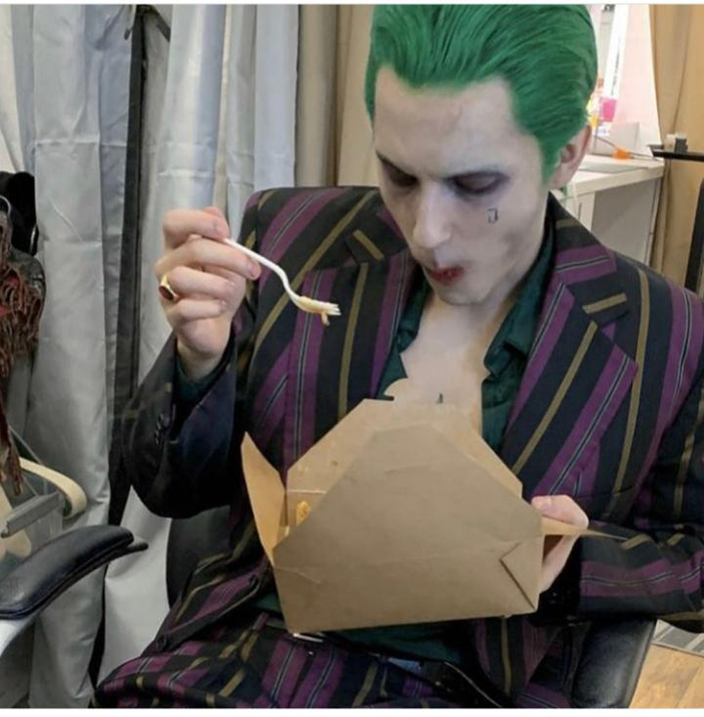 В ленте персонажа Джареда Лето нам показали только со спины, и то мельком. Как и следовало ожидать, сыграл злодея другой актер. На снимке этот «двойник» запечатлен в новом для нас образе. Значит, этот наряд подготовили для какой-то удаленной сцены.