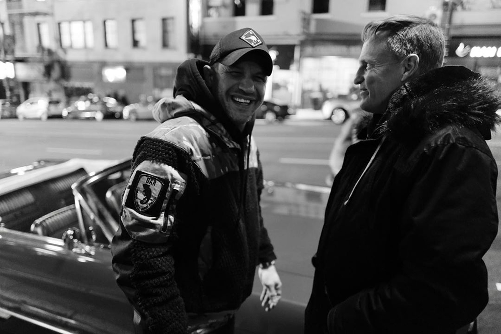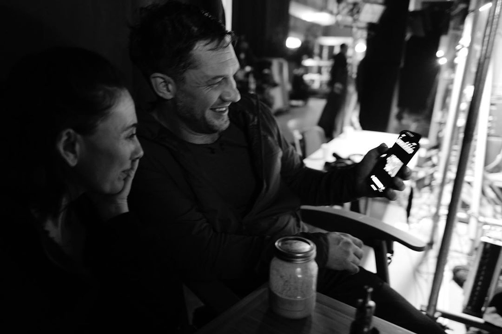 Выложили атмосферные кадры актер Том Харди (Эдди Брок/ Веном) и фотограф Грег Уильямс. На них запечатлены сам Харди, его коллега Вуди Харрельсон (Клетус Кэссиди/ Карнаж), режиссер Энди Серкис и сценаристка Келли Марсел: