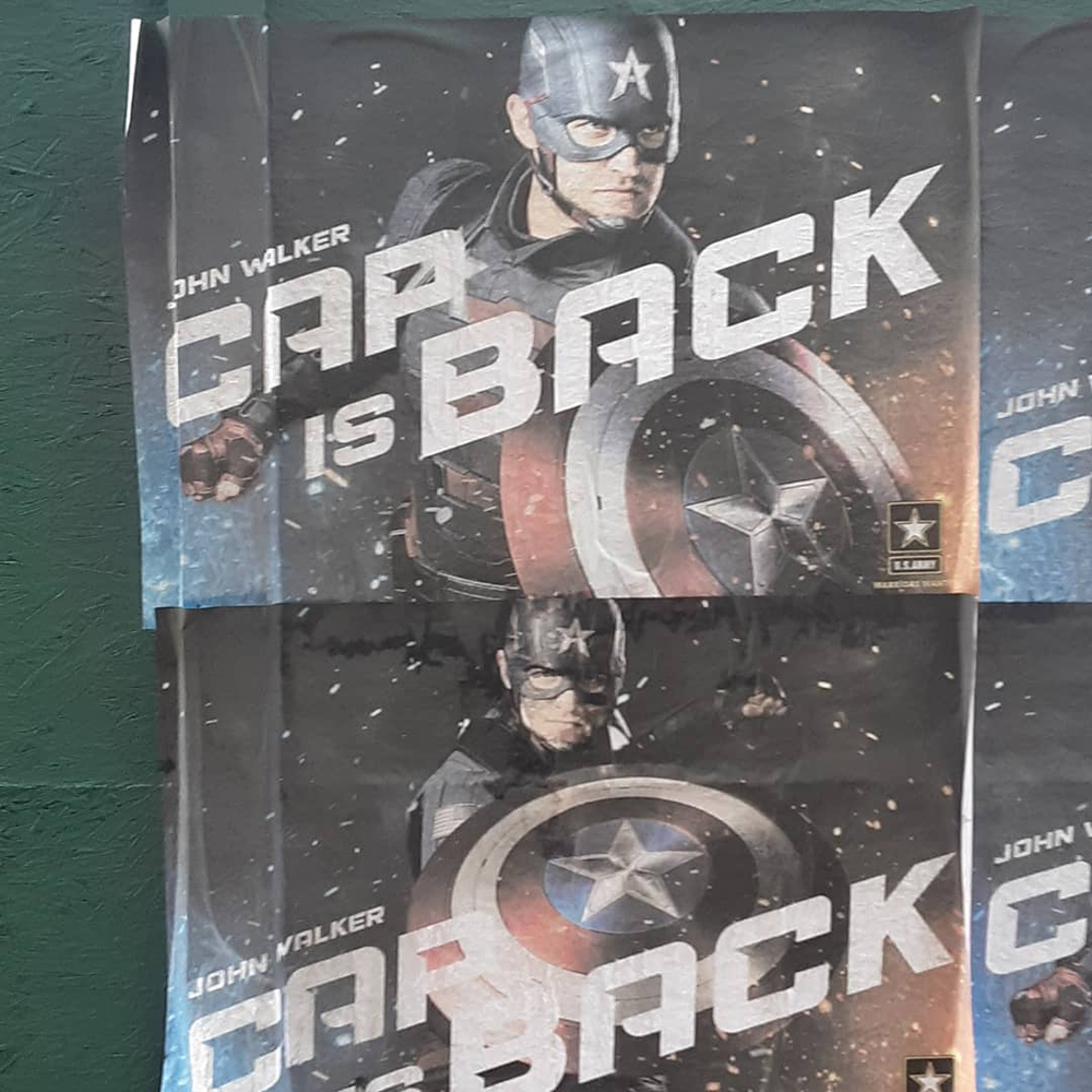 На снимке запечатлены пропагандистские плакаты армии США с сообщением о том, что Капитан Америка вернулся. Однако теперь стоять на страже порядка под этим именем вместо Стива Роджерса (Крис Эванс) будет отважный Джон Уокер в исполнении Уайатта Рассела:
