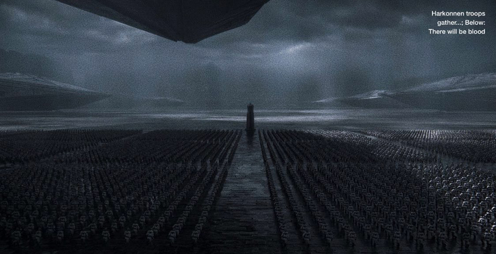 Многие прошлые снимки были сосредоточены на отдельных персонажах, лишь в некоторых случаях нас погружали в атмосферу новой адаптации книг Фрэнка Герберта. Теперь же мы наконец-то можем ощутить весь масштаб постановки благодаря мощному кадру с огромной армией Дома Харконнен. Люди барона Владимира Харконнена (Стеллан Скарсгард) - это грозные бойцы. Легион таких воинов не пощадит никого.