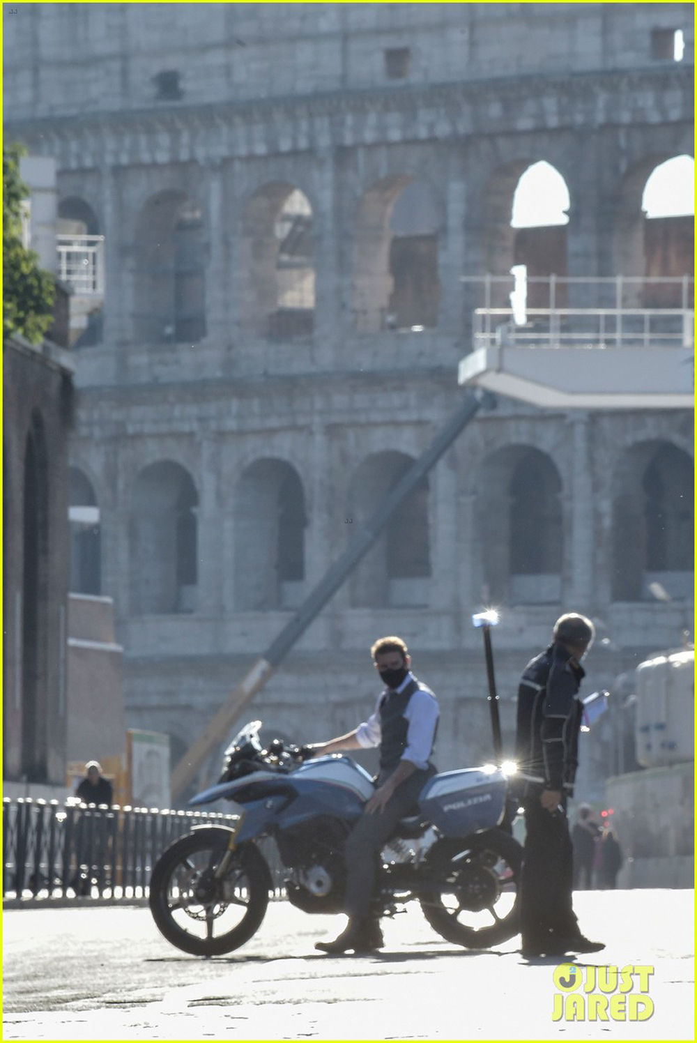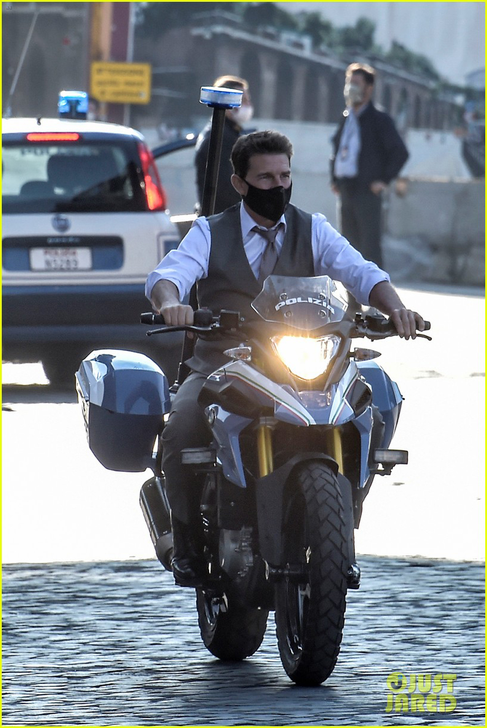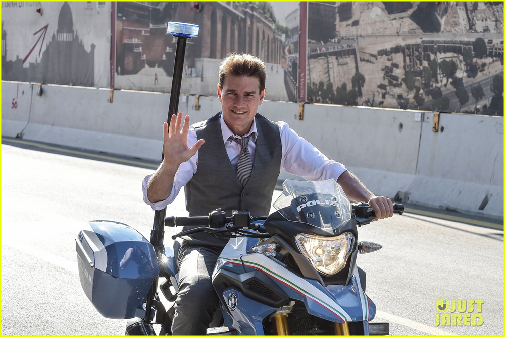 Мы уже видели, как Том Круз вместе с Хейли Этвелл участвует в автомобильной погоне. На прошлых снимках актеры засветились сразу в двух машинах. Теперь же исполнителя роли Итана Ханта заметили на полицейском мотоцикле. Актер радостно гоняет по улицам столицы Италии, недалеко от Колизея: