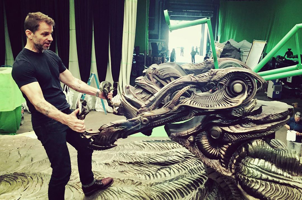 Снимками поделился оператор кроссовера киновселенной DC Фабиан Вагнер у себя в Instagram. На них запечатлены масштабные конструкции с синими и зелеными фонами для дальнейших визуальных эффектов, а также сам Снайдер за крутым на вид устройством: