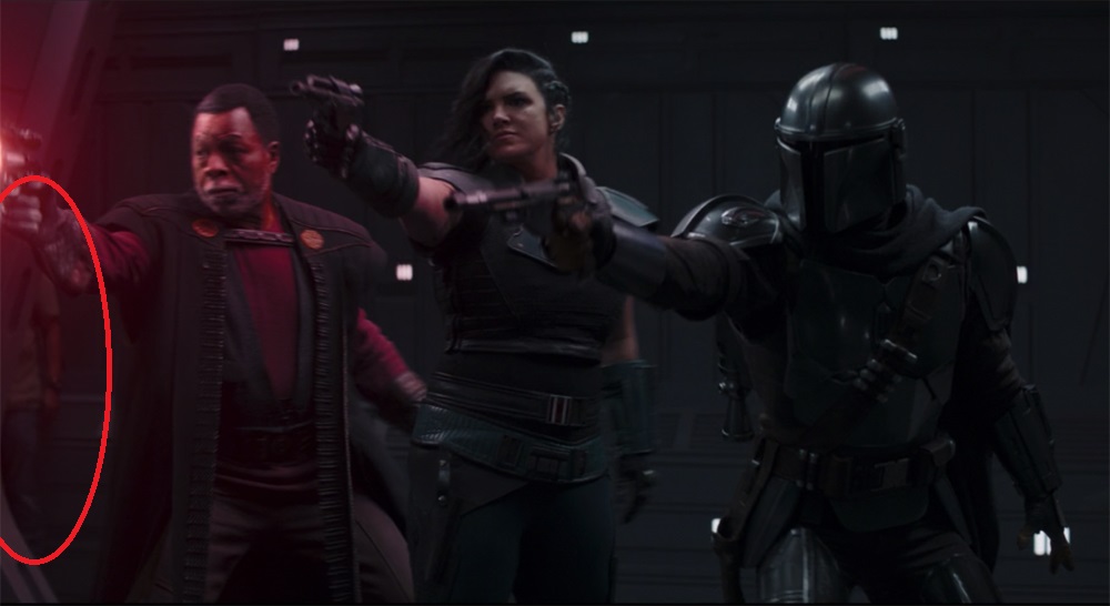 Так, в сцене перестрелки из 4 эпизода «Глава 12: Осада» компанию Дину Джарину (Педро Паскаль), Грифу Карге (Карл Уэзерс) и Карасинтие «Каре» Дюн (Джина Карано) составил некий член съемочной группы. Скромно спрятался в сторонке: