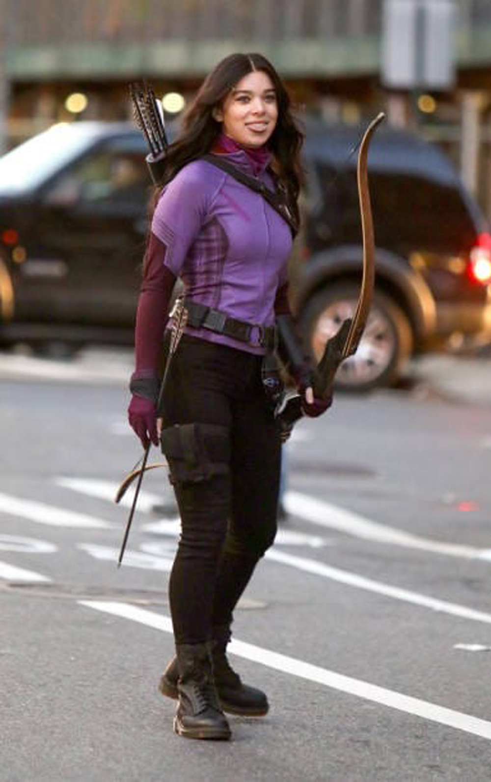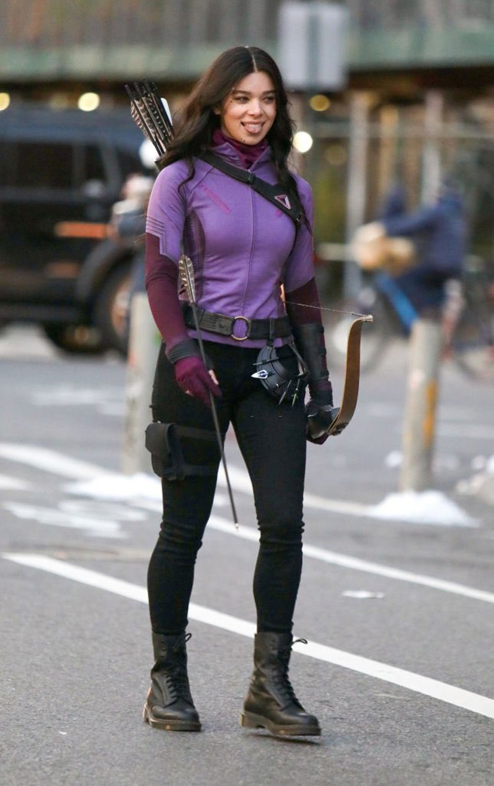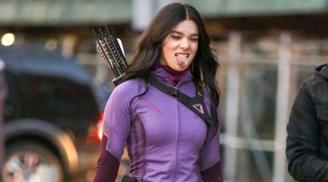 За последнее время мы уже увидели много фотографий со съемок, но свежие особенные, ведь на них нам впервые показали супергеройский образ Кейт Бишоп в исполнении звезды «Бамблби» Хейли Стайнфелд. Как видим, выполнен фиолетовый костюм девушки в духе ее образа из комиксов Marvel:
