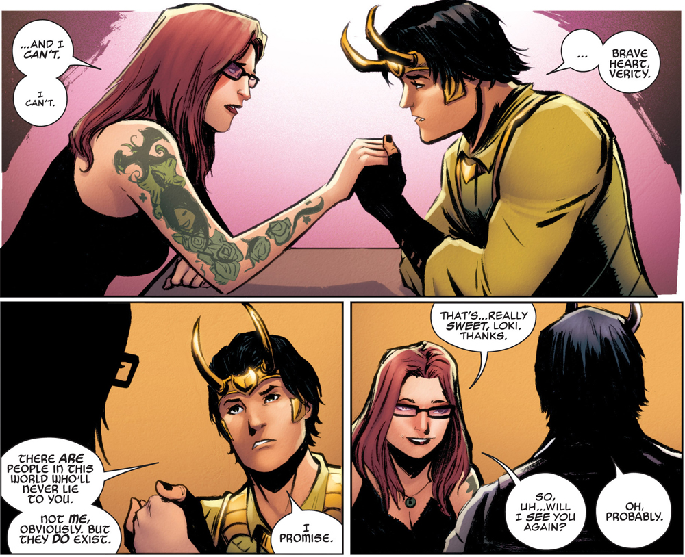 На Земле Локи пересекается Верити, с которой очень сближается. Героиня в результате несчастного случая получает способность распознавать ложь и иллюзии, что очень интересно для истории бога обмана.