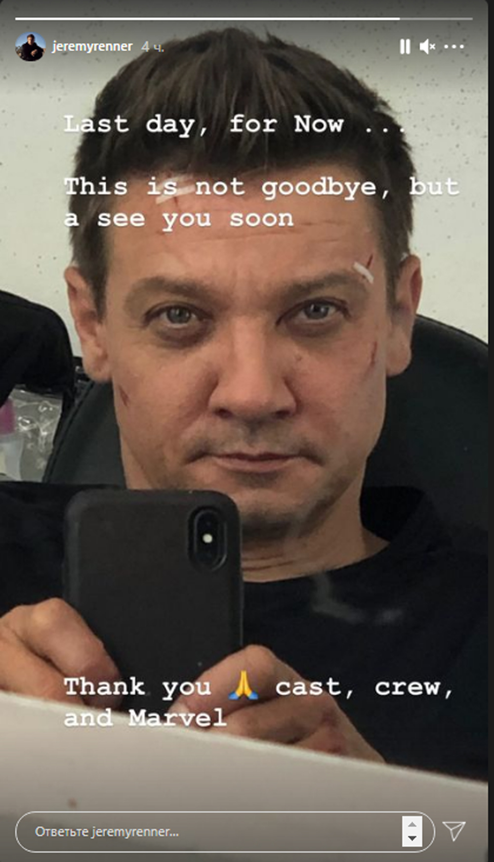 Джереми Реннер опубликовал в Stories Instagram новый кадр со съемок сериала Disney+ «Соколиный Глаз», которым актер объявил о завершении производства.