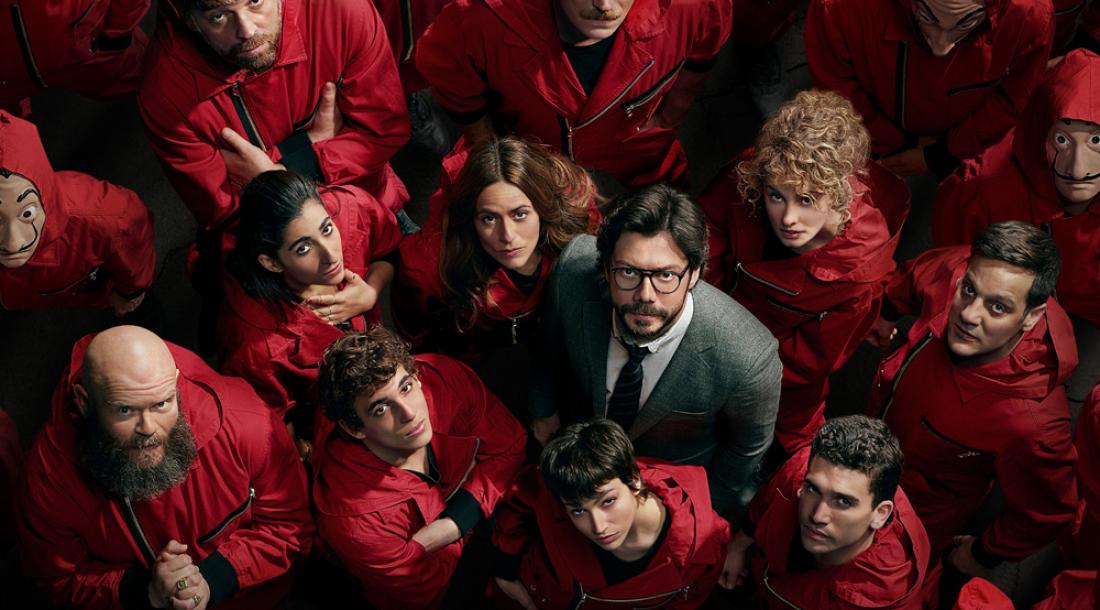 На снимке собрались все основные герои популярного шоу о грандиозных ограблениях, которыми руководит гений Профессор/ Серхио Маркина (Альваро Морте). В комментарии написали: