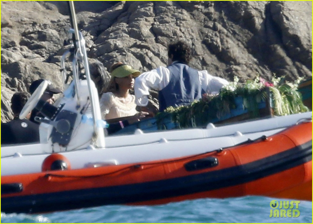 На снимках можно увидеть, как Ариэль и Эрик в исполнении Холли Бэйли и Джоны Хауэра-Кинга катаются в красивых нарядах на моторной лодке. В мультфильме была похожая сцена, в которой возлюбленные отправились в романтическое плавание на обычной лодке.