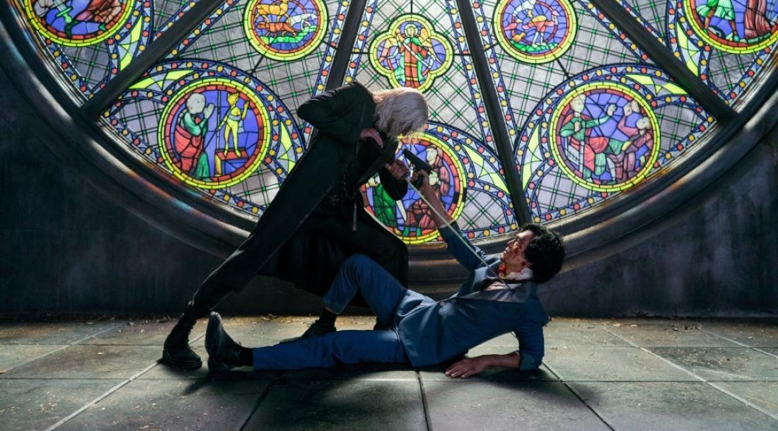 Так, на одном фото можно увидеть, как Спайк Шпигель (Джон Чо) целится из пистолета в своего заклятого врага Вишеза (Алекс Хэсселл). Злодей же наставил на Спайка меч. И этот напряженный поединок разворачивается на фоне витража.