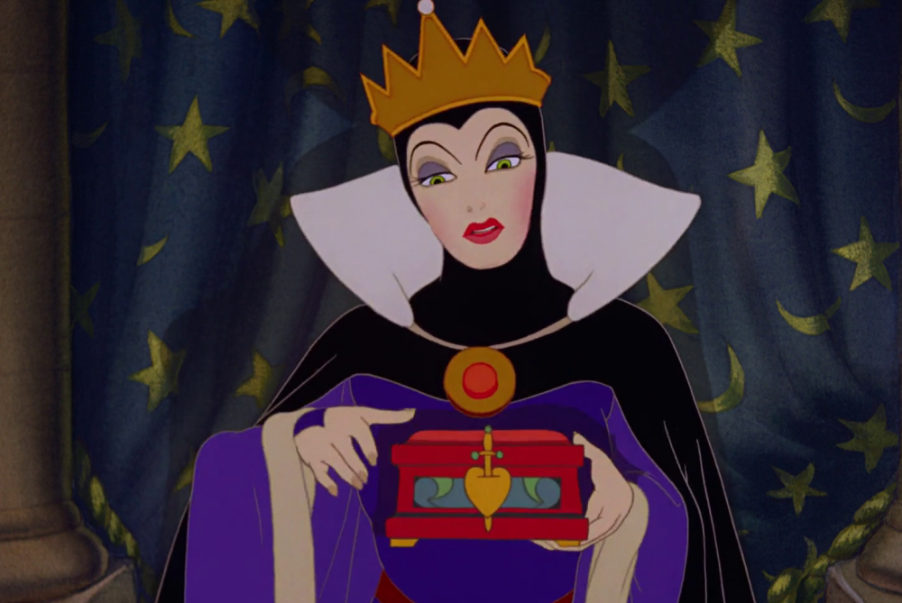 По сюжету классического мультика Disney «Белоснежка и семь гномов», основанного на сказке братьев Гримм, Злая королева предстает эгоистичной и властной женщиной, которая наслаждается своей красотой и много времени уделяет самолюбованию. Злодейка периодически спрашивает у волшебного зеркала, действительно ли она самая красивая на свете. Однажды зеркало отвечает, что все же симпатичнее Белоснежка – падчерица Королевы. Злодейка гневается и открывает охоту на невинную девушку.
