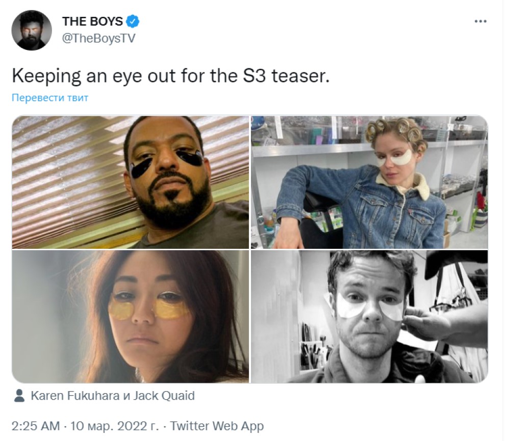В Twitter «Пацанов» опубликовали пост (выше) с намеком на то, что скоро выйдет первый полноценный тизер-трейлер 3 сезона. В комментарии к публикации указали, что актеры Джек Куэйд, Эрин Мориарти, Лаз Алонсо и Карен Фукухара приглядывают за тизером – с патчами под глазами.