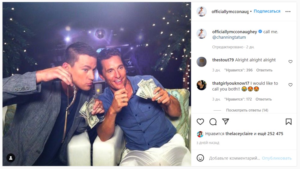 «Супер Майк 3» выйдет на онлайн-платформе HBO Max. Пока что не уточняется, когда ждать премьеру и кто еще снимется в фильме. Однако звезда первой части Мэттью МакКонахи намекнул в Instagram, что он хочет вернуться к роли Далласа. Актер выложил совместный снимок с Татумом и в комментарии предложил коллеге позвонить ему.