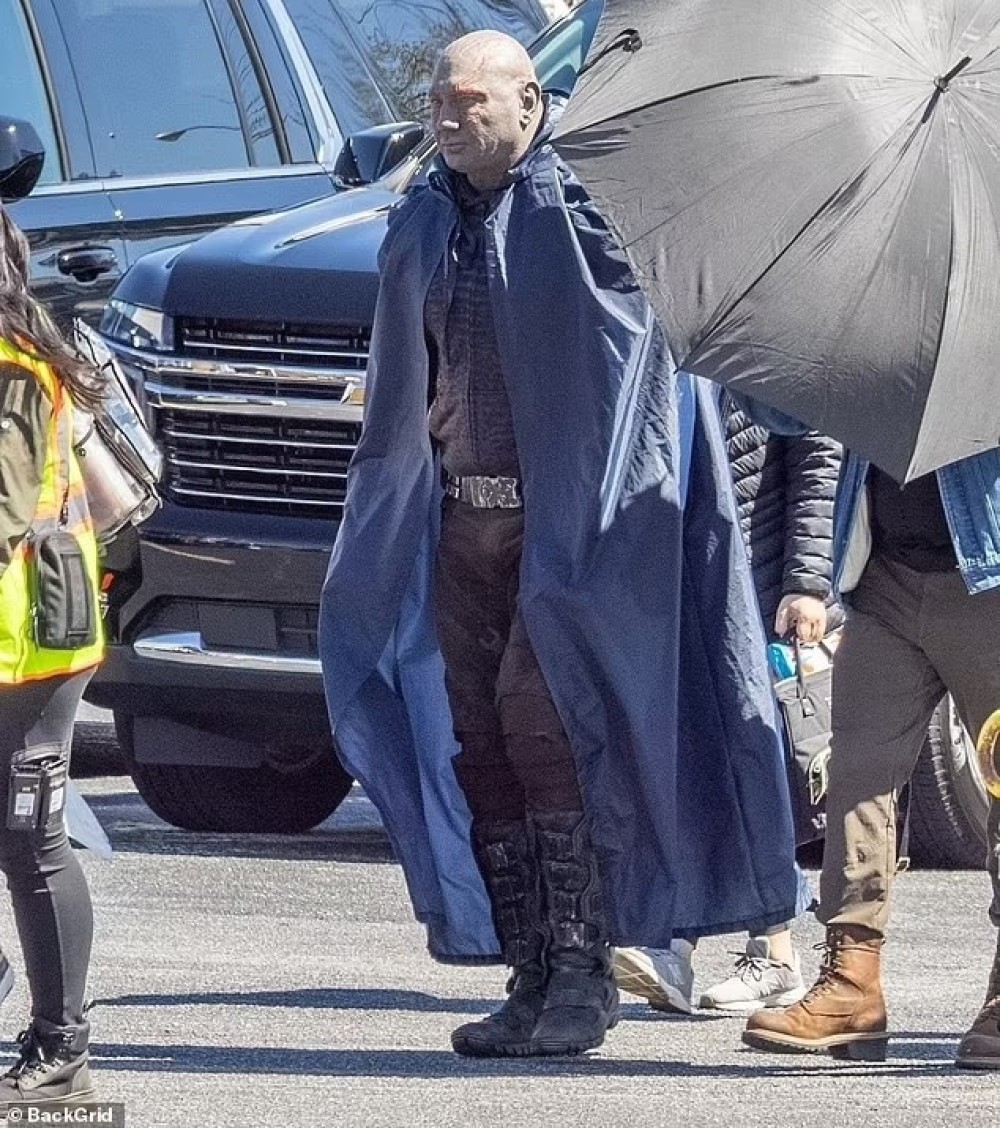 На снимках актеры предстали в своем инопланетном гриме. Образ Клементьефф закрыт курткой, так что пока мы не можем узнать, будет ли у Мантис новый образ. А вот Батиста не полностью прикрыл свой наряд, поэтому мы можем хорошо его рассмотреть.