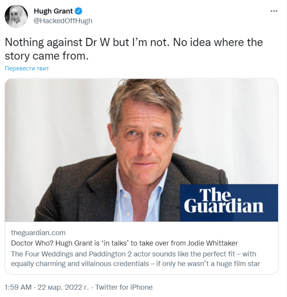 Теперь Хью Грант ответил на слух. Звезда «Джентльменов» и «Приключений Паддингтона 2» написал у себя в Twitter, что он на самом деле не станет новым Доктором Кто: