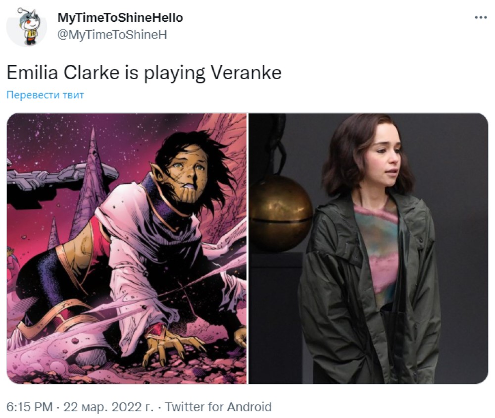 Так, на просторах Twitter появился слух, что Эмилия Кларк играет Веранке. В комиксах Marvel Веранке выступает злодейкой, так что, скорее всего, и ее версия в киновселенной Marvel будет представлять команду плохих ребят. Веранке выступает королевой скруллов. Кларк не привыкать исполнять роли таких влиятельных политических фигур – в «Игре престолов» она сыграла Матерь драконов Дейенерис Таргариен.