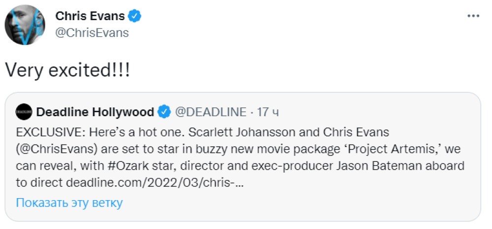 Крис Эванс счастлив воссоединиться со Скарлетт Йоханссон. Актер написал в Twitter, что в полном восторге от возможности вновь поработать с актрисой: