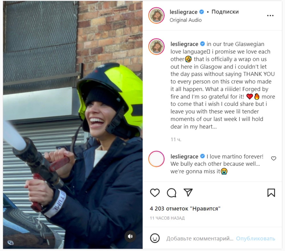 В комментарии к посту Лесли Грейс написала, что съемки «Бэтгерл» в Глазго завершились. Актриса поблагодарила всех участников команды за то, что помогли создать первый сольник Бэтгерл киновселенной DC. И актриса отметила, что фильм «выкован в огне» – это явный намек на главного злодея, пиромана Светлячка (Брендан Фрейзер):