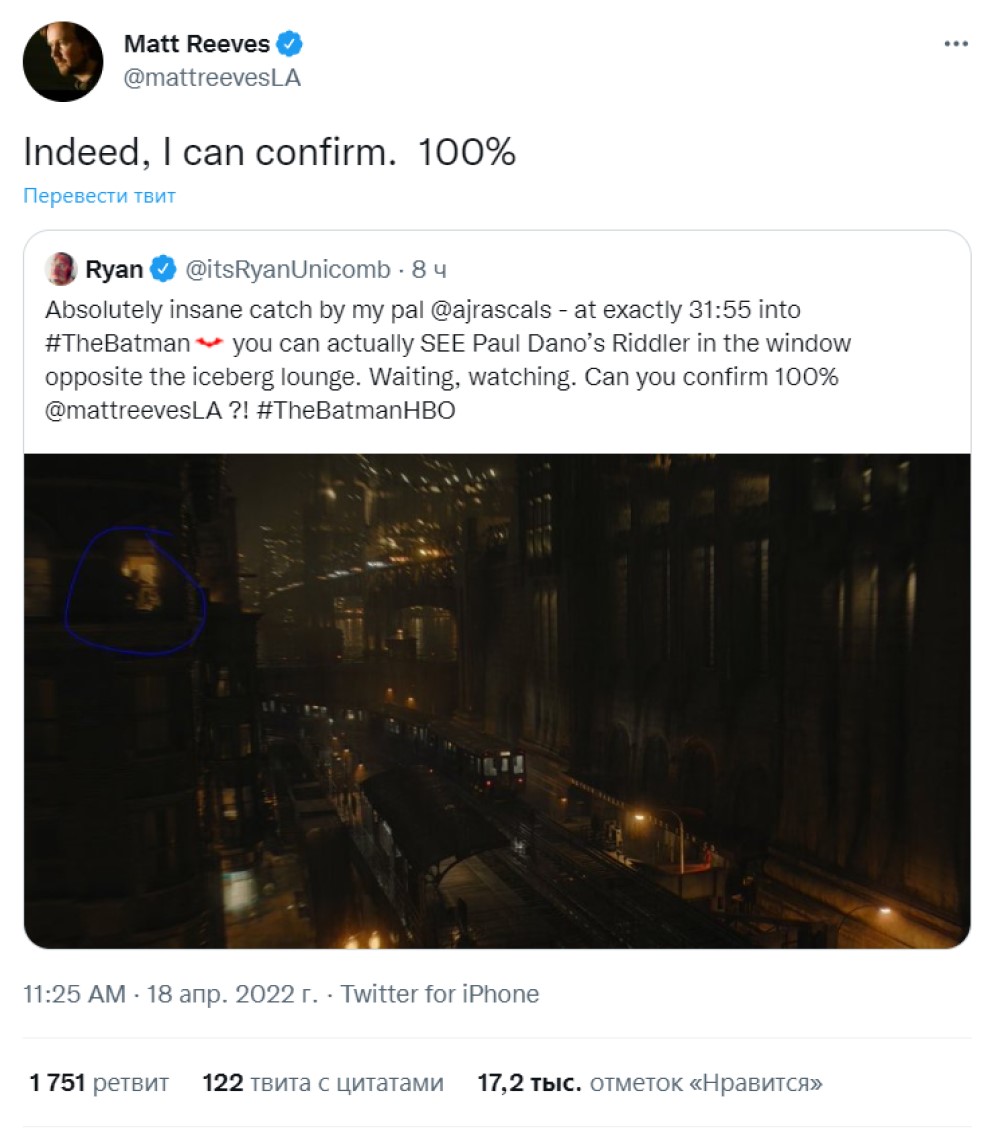 Ривз прокомментировал пост фаната. Автор ответил, что в окне засветился действительно Загадочник: