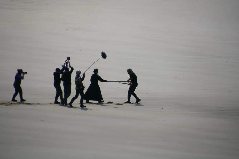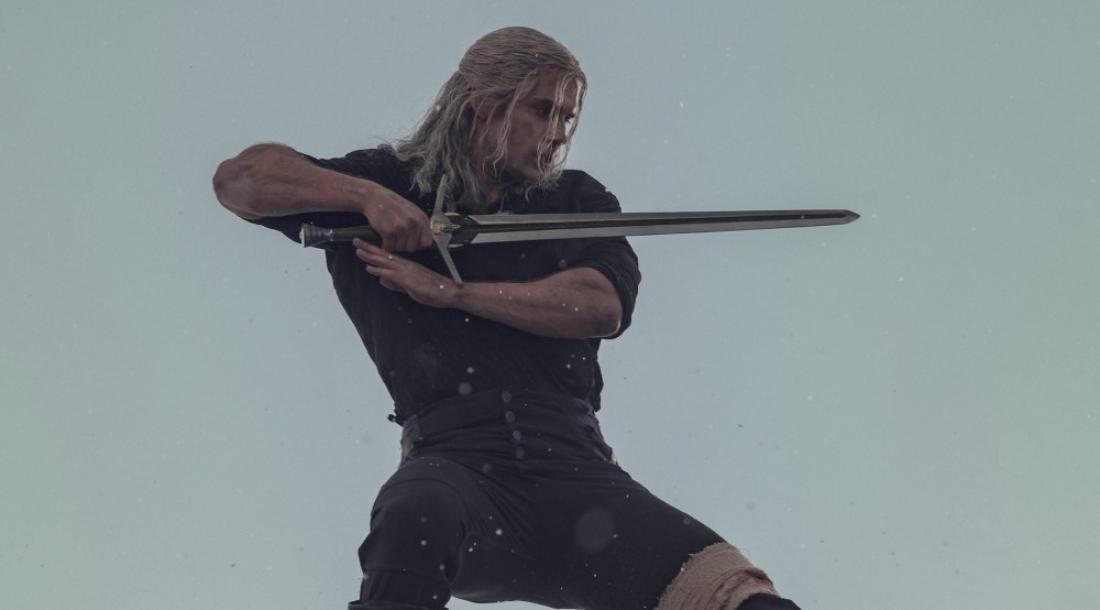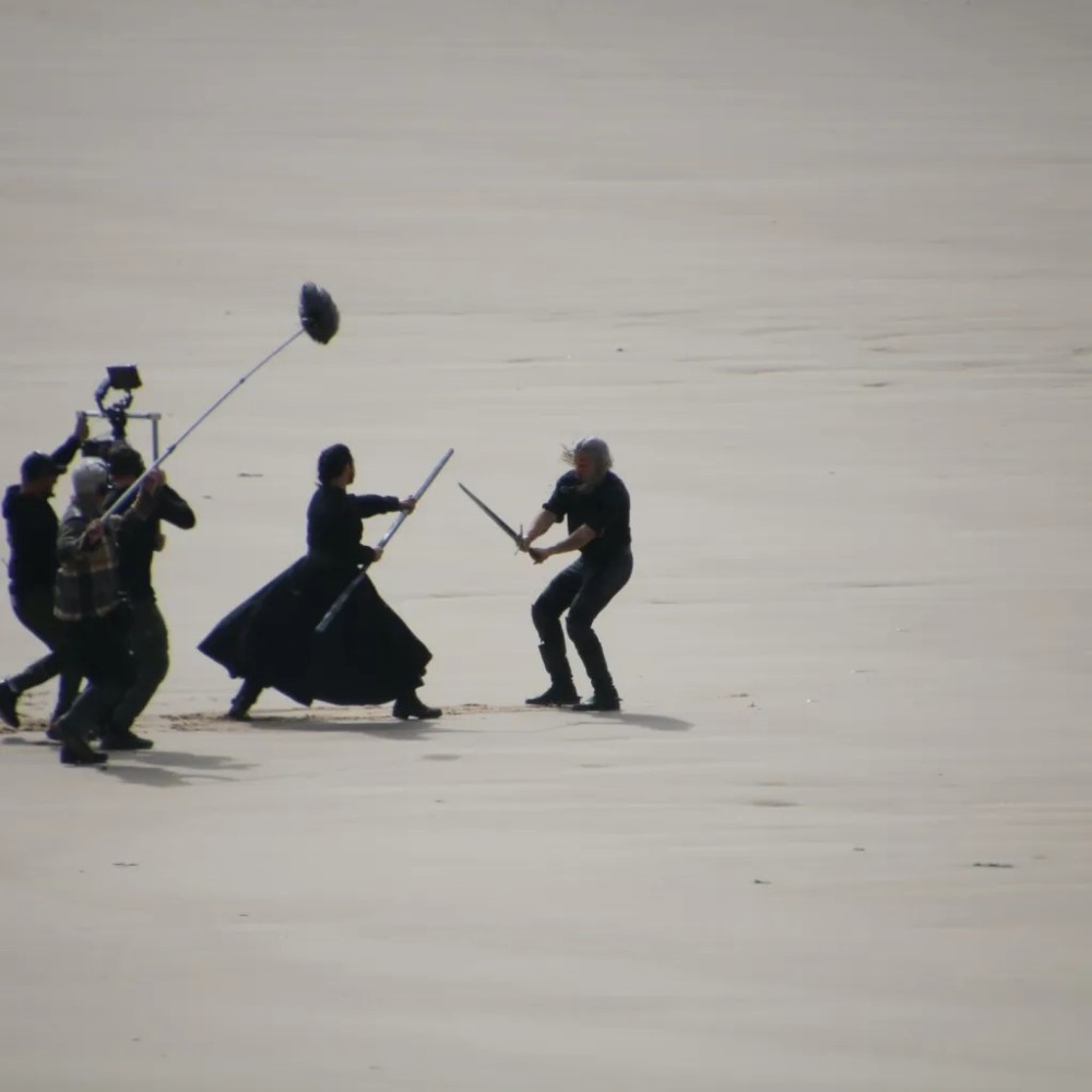 Это съемки культового сражения Геральта и Вильгефорца из четвертой книги цикла Анджея Сапковского «Час Презрения», по которой снимают сезон. В бою Геральт использует меч, а Вильгефорц вооружился боевым посохом – так было и в романе.
