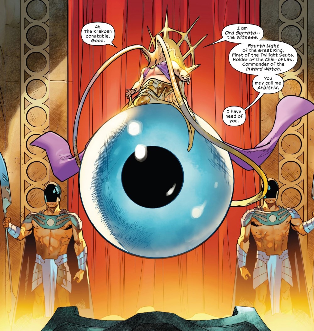 В первой половине фильма Тор (Крис Хемсворт), Могучий Тор/ Джейн Фостер (Натали Портман), Валькирия (Тесса Томпсон) и Корг (Тайка Вайтити) отправляются во Всемогущий город, чтобы попросить у Зевса (Рассел Кроу) помощи в битве с Горром Убийцей Богов (Кристиан Бейл). Во Всемогущем городе Зевс устраивает собрание богов, среди которых засветилось гигантское глазное яблоко. Скорее всего, это Ора Серрата.