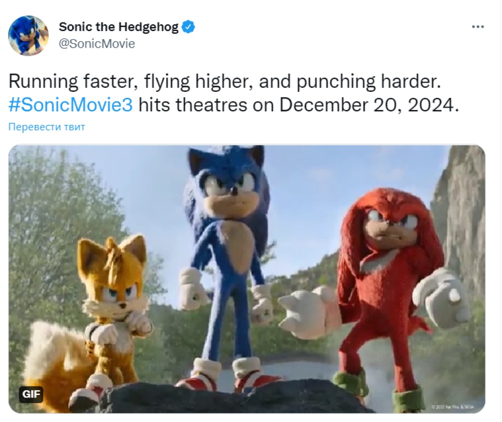 Дату релиза «Соника 3 в кино» раскрыли на официальной странице франшизы в Twitter. Как указали в посте, фильм о новых приключениях суперскоростного ёжика Соника выйдет 20 декабря 2024 года. К публикации прикрепили GIF-анимацию с Соником и его друзьями лисенком Майлзом «Тейлзом» Прауэром и Ехидной Наклзом. А в комментарии написали: