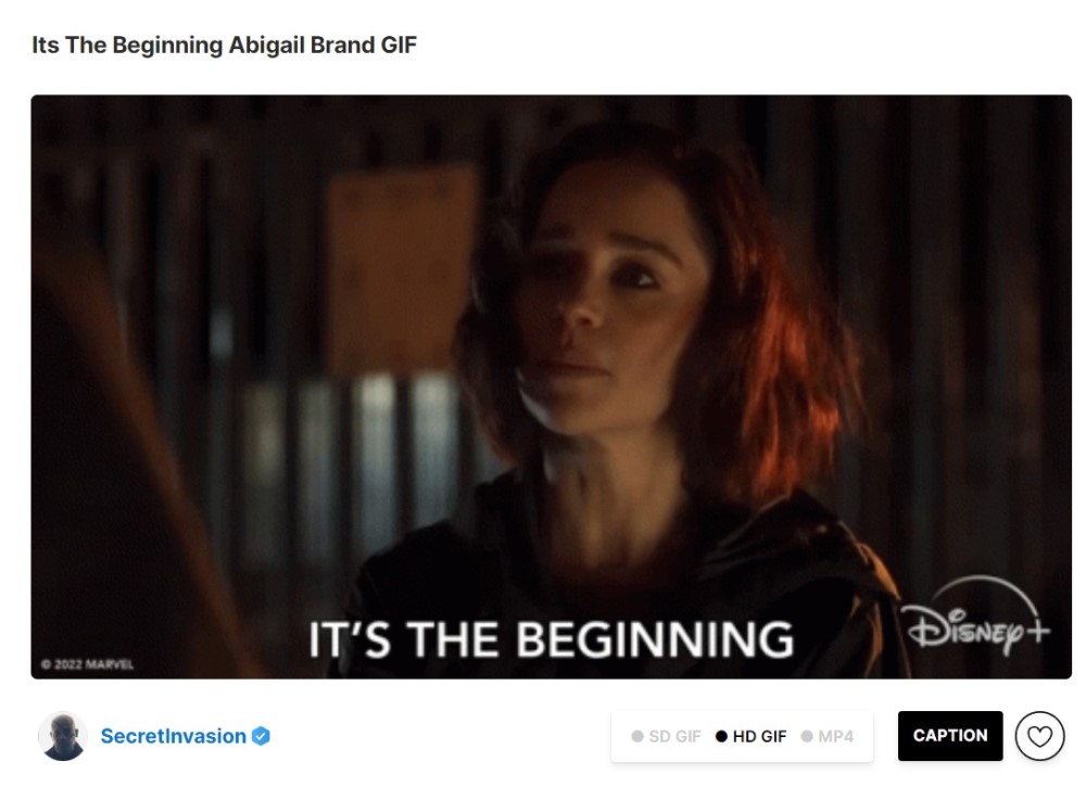 На сайте Tenor создали страницу, посвященную сериалу «Секретное вторжение». Там выложили GIF-изображение с героиней Эмилией Кларк, которая говорит: «Это начало». В посте можно увидеть, что сам файл называется так: «Это начало Эбигейл Бранд».