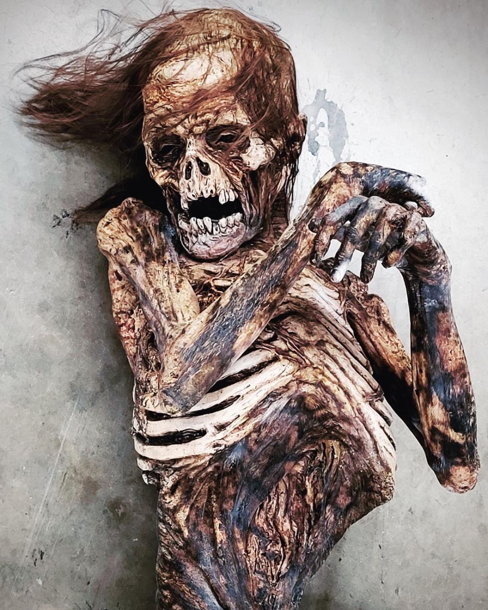 Кадром поделился у себя в Instagram мастер по созданию грима и постановщик спецэффектов Грег Никотеро. Зомби на фото больше напоминает скелет. Можно было бы предположить, что это существо мертво. Однако в мире «Ходячих мертвецов» даже такие зомби могут представлять большую опасность. Некоторые зомби не двигаются, пока к ним не подойдет человек.