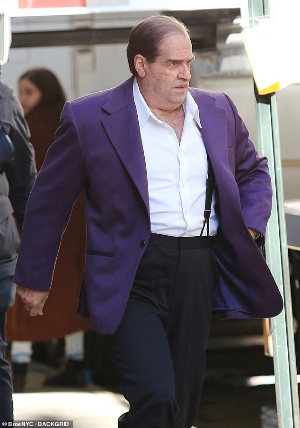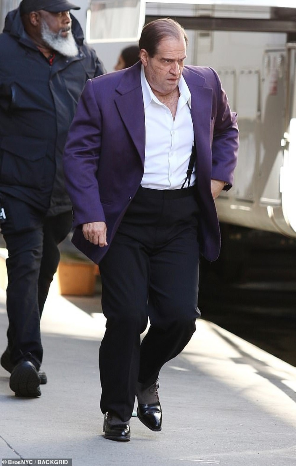 Фотографиями поделился портал Mail Online. На них Колин Фаррелл предстал в гриме и протезах, благодаря которым он перевоплотился в упитанного мафиози. Пингвин встретился с Софией Фальконе в исполнении Кристин Милиоти. Это дочь бывшего главы криминального мира Готэма Кармайна Фальконе (Джон Туртурро), которого убили в «Бэтмене».