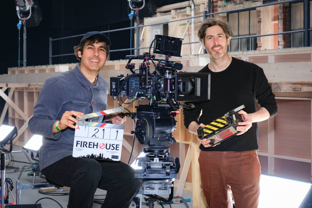 Кинан на снимке держит хлопушку с лого и рабочим названием фильма «Пожарная станция», а Райтман – ловушку для призраков. Находятся авторы рядом с декорациями пожарной станции в Нью-Йорке. В этом месте оригинальные охотники за привидениями обустроили штаб-квартиру.