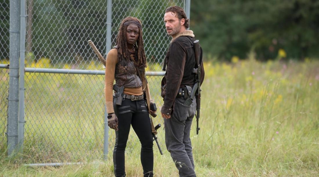 Свежие фото появились на просторах Twitter. На них Рик и Мишонн куда-то стремительно бегут, а их преследует группа ходячих. На Рике можно заметить рюкзак – возможно, такой же есть и у Мишонн, просто его не видно.