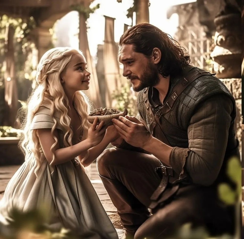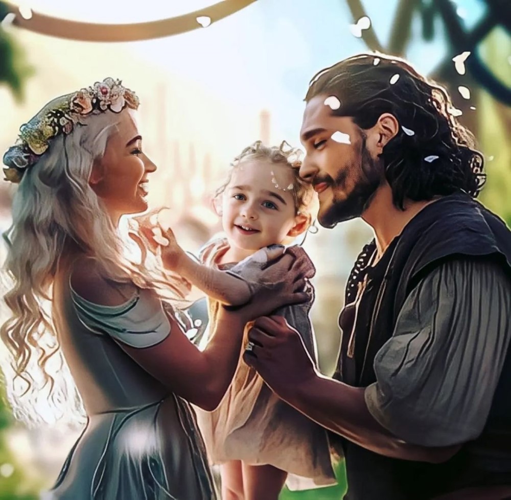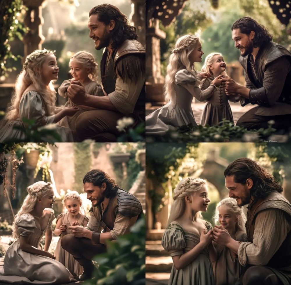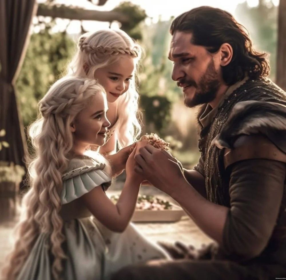 Фанат с ником Jonertstargaryen в ожидании заключительных частей серии «Песнь Льда и Пламени» показал свою версию развязки истории Джона Сноу и Дейенерис Таргариен. В альтернативной реальности от автора фан-артов герои получили свой счастливый конец. Здесь у них две дочери. На артах Джон и его дочери веселятся в саду Красного замка.