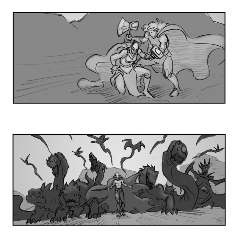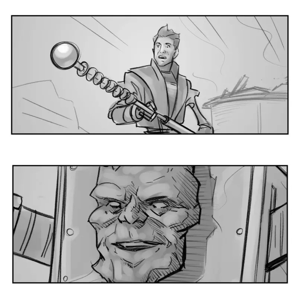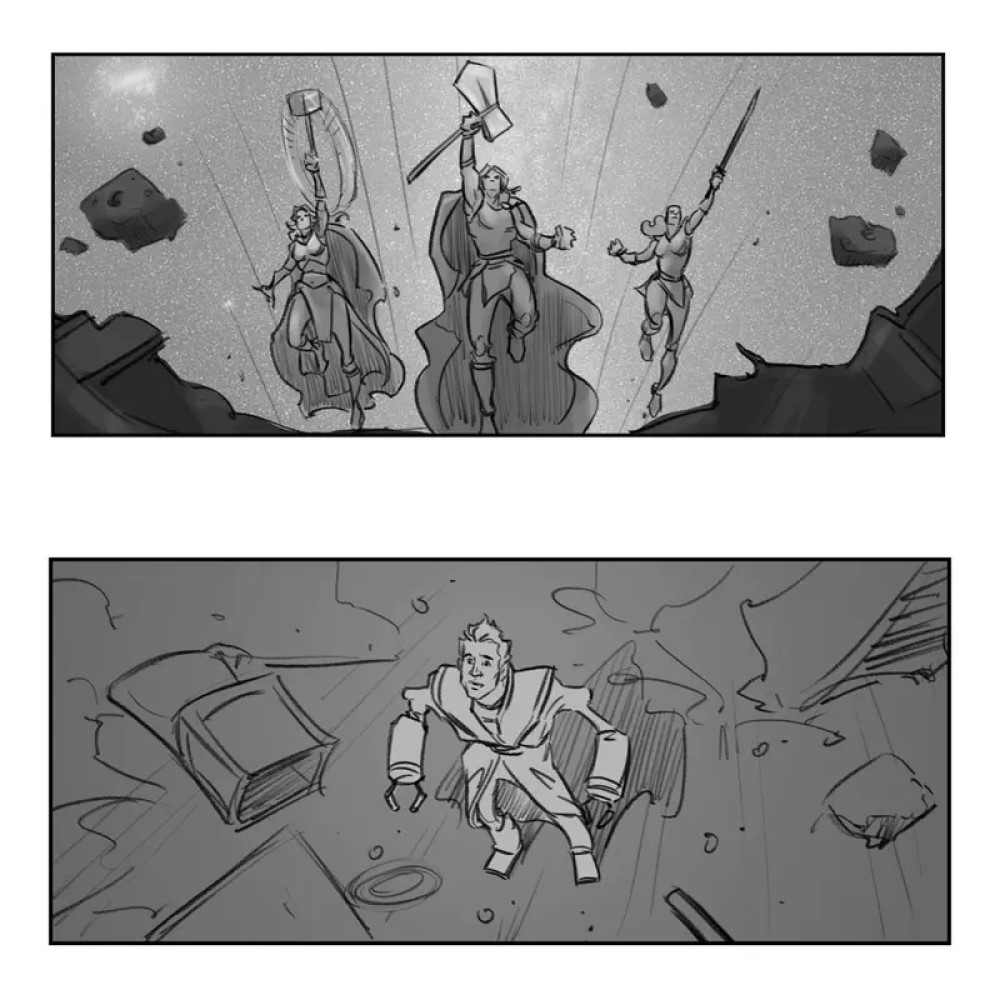 Художник Уильям Гроуб у себя на сайте опубликовал большое количество раскадровок «Тора: Любовь и гром». Среди снимков можно увидеть сцену с Грандмастером, которого убрали из фильма. Тор (Крис Хемсворт), Джейн Фостер (Натали Портман) и Валькирия (Тесса Томпсон) в этом эпизоде должны были принести Грандмастеру голову Корга (Тайка Вайтити), чтобы тот вылечил его.