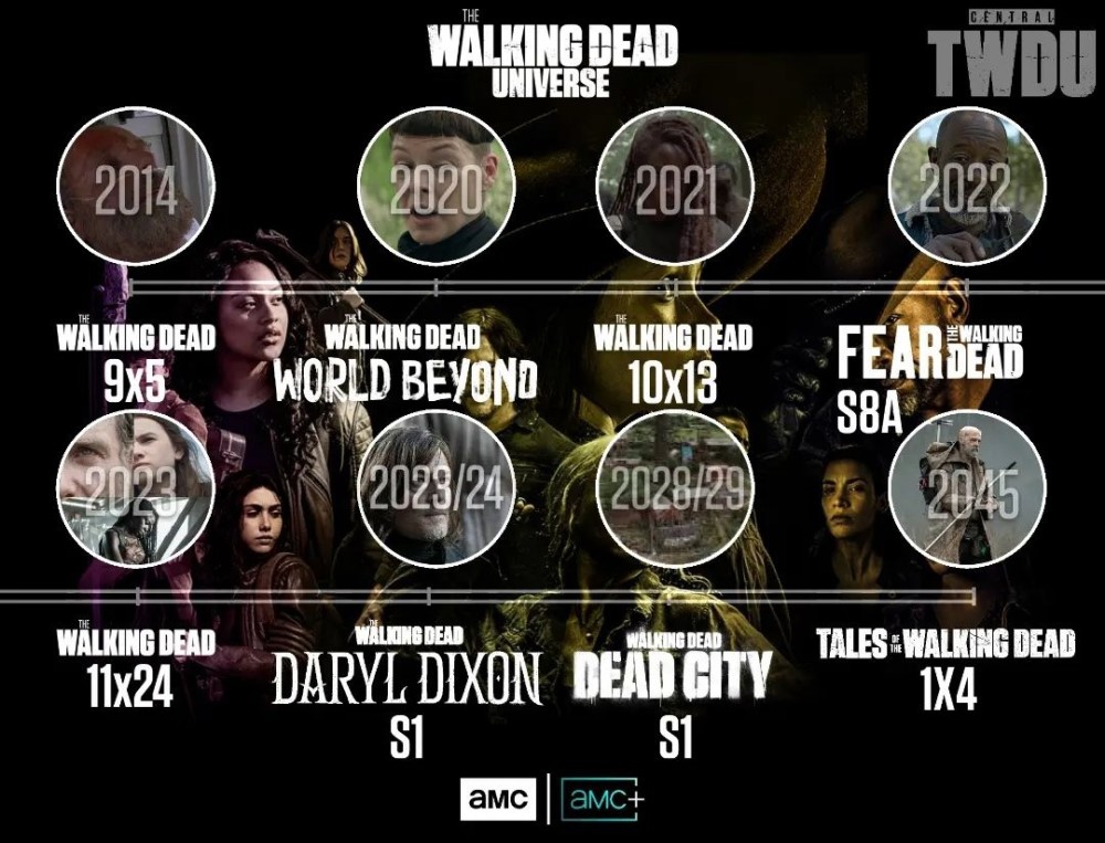 В «Мертвом городе» не назвали точное время действия, но Ниган упомянул, что его противостояние с Риком Граймсом (Эндрю Линкольн) прошло 12-15 лет назад. Лорен Коэн в интервью в рамках продвижения сериала упомянула, что в спин-оффе 5-6 летний скачок во времени после финала основного сериала. Однако самый поздний период показали в антологии «Истории ходячих мертвецов», где можно увидеть постапокалиптическое будущее – предположительно, 2045 год.