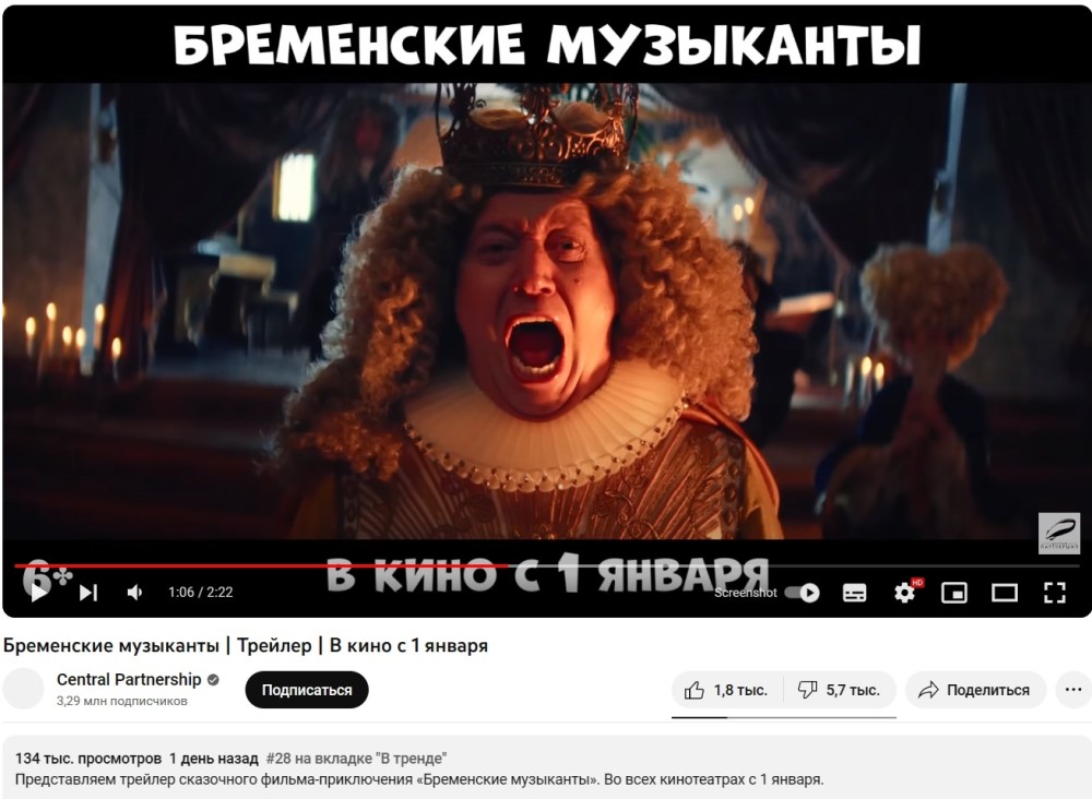 В среду, 13 сентября, вышел первый трейлер фильма «Бременские музыканты», снятого по советскому мультфильму 1969 года и сказке братьев Гримм. Зрителям ролик совсем не понравился – дизлайков у него в три раза больше, чем лайков. В комментариях особенно ругают «разрушающие психику» образы говорящих зверей.