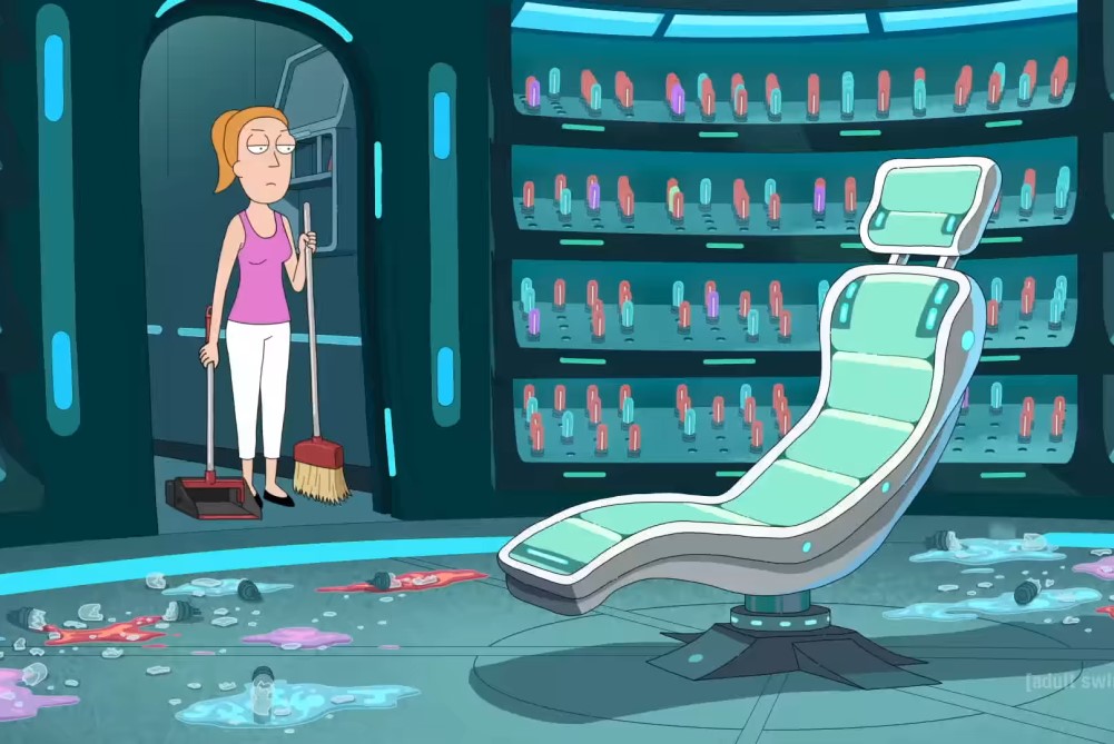 В трейлере на отметке 0:10 можно вновь увидеть помещение с креслом и колбами с воспоминаниями из эпизода «Мозговыносяшки Морти». Сцену показали на короткое время вместе со множеством других эпизодов, поэтому придется нажать на паузу, чтобы ее как следует рассмотреть. В комнате оказалась Саммер, которая пришла туда убрать разбитые колбы. Видимо, нас ждет еще одна серия о «мозговыносяшках», в которой раскроют новые мрачные подробности о прошлом Рика и Морти.