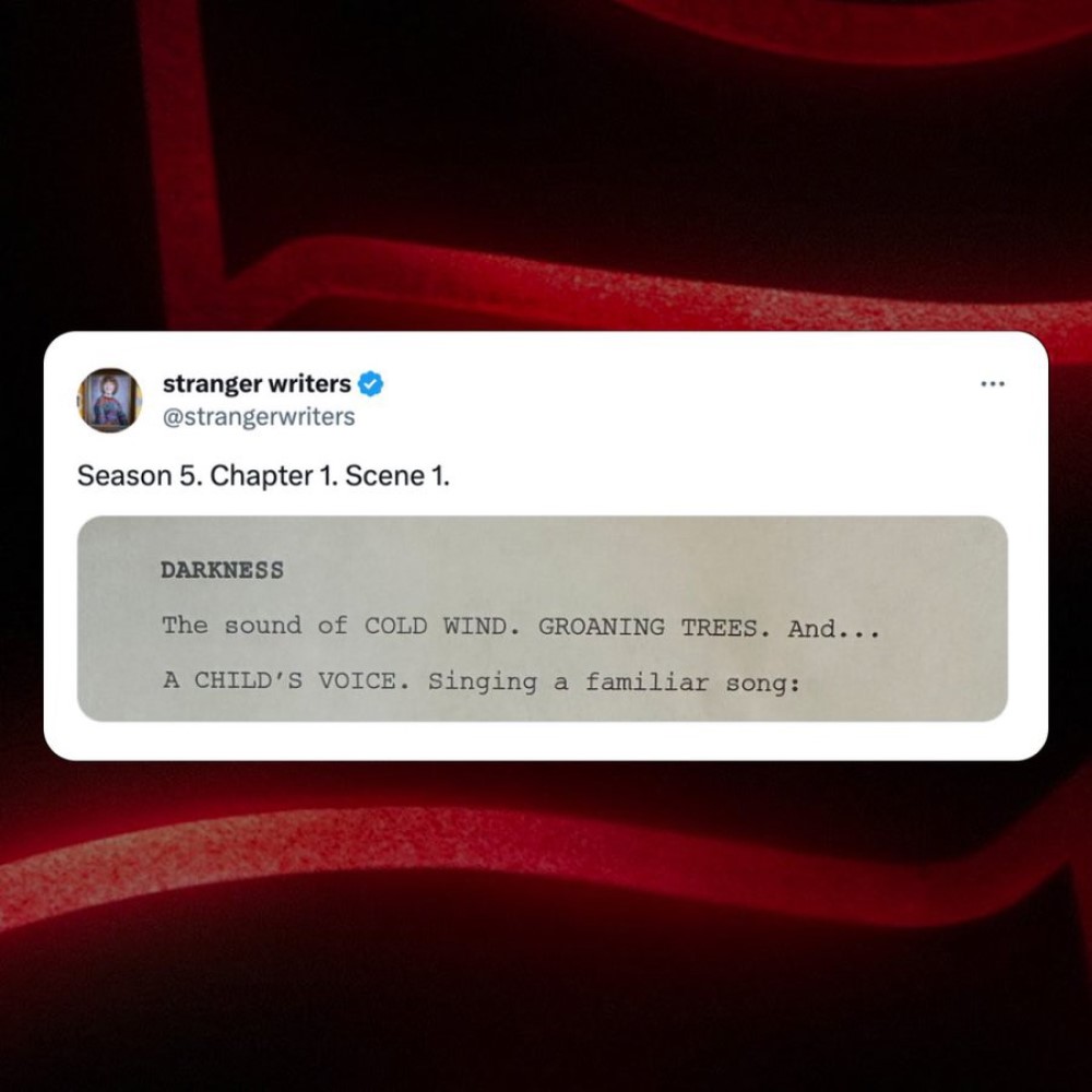 На официальной странице сценаристов «Очень странных дел» в соцсетях выложили отрывок из сценария 1 эпизода 5 сезона. Такой сюрприз авторы сделали фанатам в честь Дня «Очень странных дел», который отмечается 6 ноября. По сюжету 1 сезона именно 6 ноября 1983 года таинственным образом исчез юный житель Хокинса Уилл Байерс (Ноа Шнапп), которому пришлось в одиночку выживать в Изнанке.