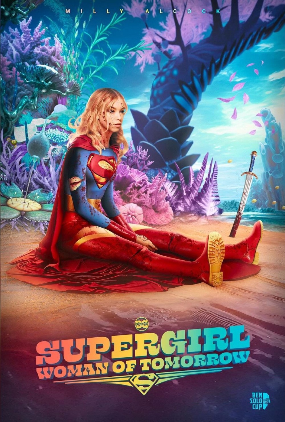 Фильм «Супергерл: Женщина завтрашнего дня» снимут по одноименной серии комиксов Тома Кинга (2021-2022). Художник с ником BenSolo_Cup в своей работе повторил одно из изображений «Супергерл: Женщина завтрашнего дня», на котором Кара Дэнверс отдыхает после напряженного боя. Олкок предстала в культовом супергеройском костюме Супергерл. На Каре кровь, а рядом с ней воткнут в землю окровавленный меч.