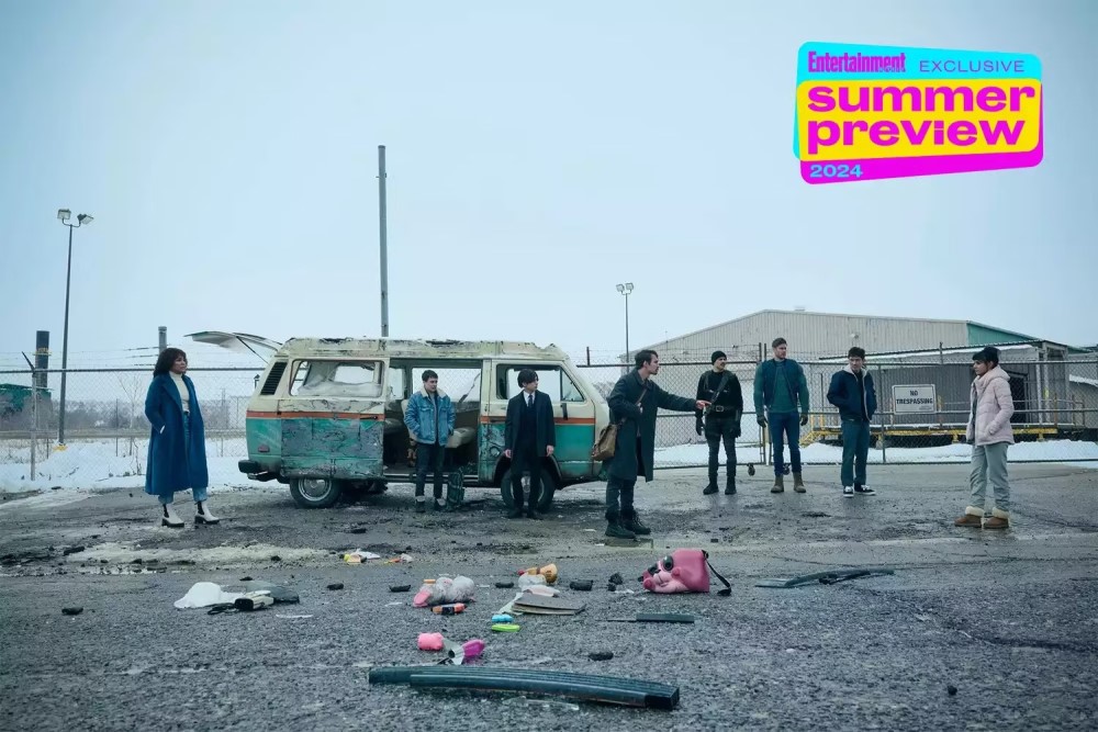 На фото засветились Лютер (Том Хоппер), Виктор (Эллиот Пейдж), Клаус (Роберт Шиэн), Номер Пять (Эйдан Галлахер), Эллисон (Эмми Рэвер-Лэмпман), Диего (Дэвид Кастанеда), Бен (Джастин Х. Мин), а также Лайла Питтс (Риту Эрийа). На дороге среди мусора можно увидеть сломанную розовую маску. Точно такую же носила наемница из Комиссии Ча-Ча (Мэри Джей Блайдж).